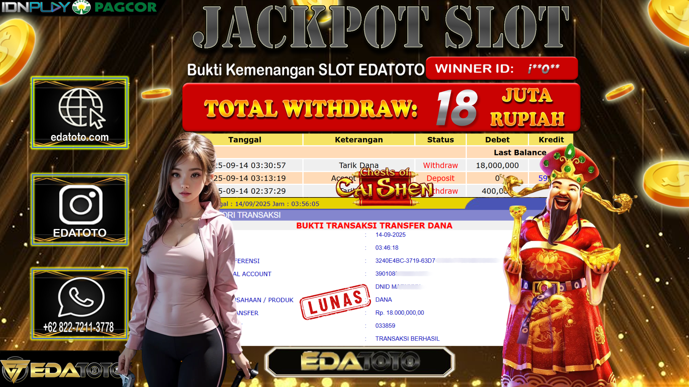 Selamat Kepada Pemilik user ID : i**0** Hari/Tanggal : Minggu/ 14, September 2025 Jackpot : Rp. 18.000.000 JT Permainan : . . .
