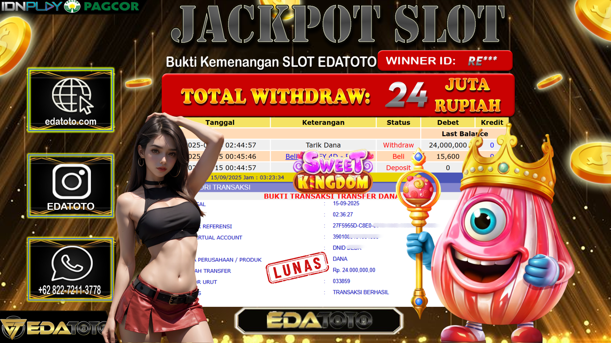 Selamat Kepada Pemilik user ID : RE*** Hari/Tanggal : Senin/ 15, September 2025 Jackpot : Rp. 24.000.000 JT Permainan : . . .