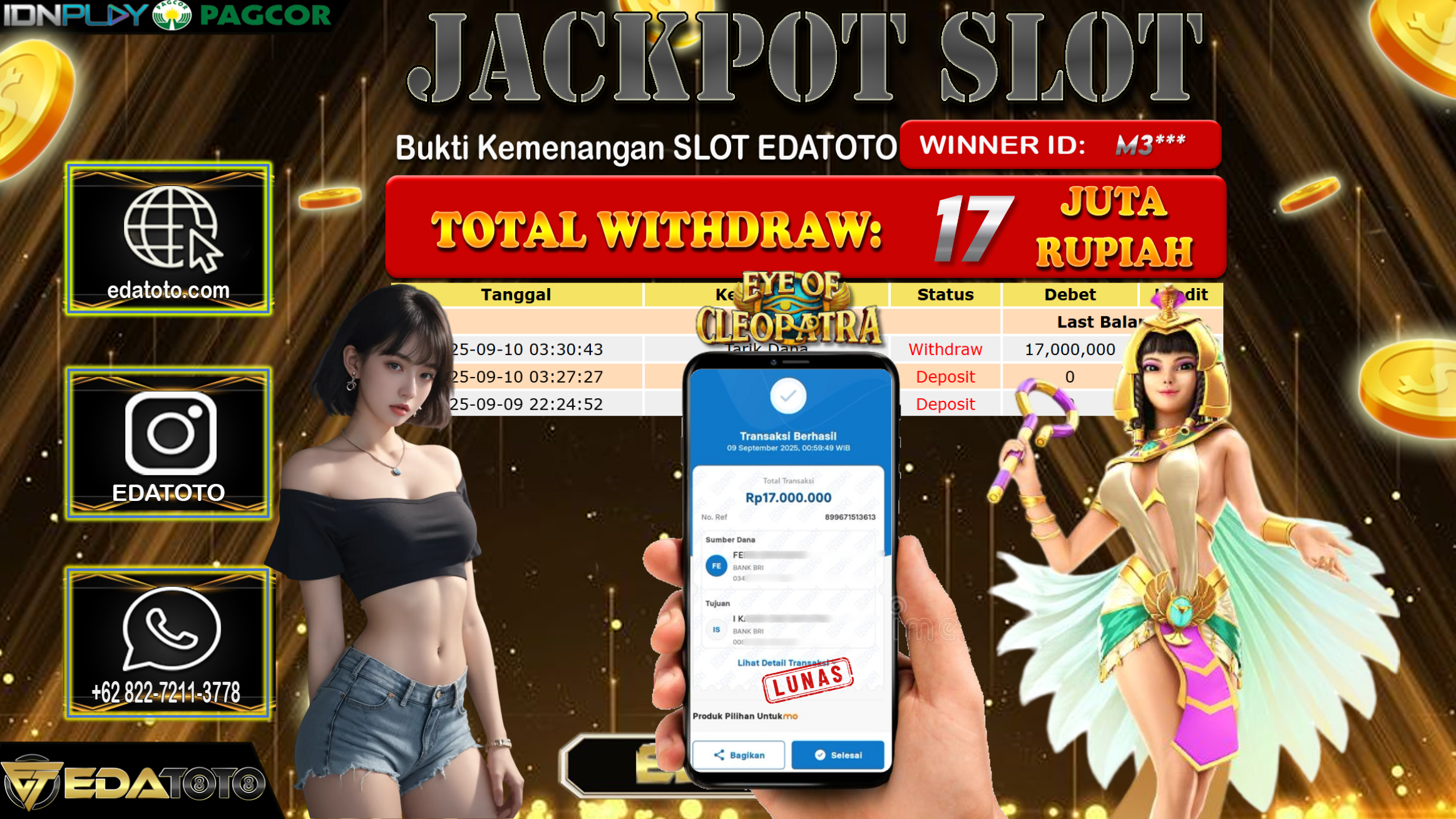 Selamat Kepada Pemilik user ID : M3*** Hari/Tanggal : Rabu/ 10, September 2025 Jackpot : Rp. 18.000.000 JT Permainan : . . .