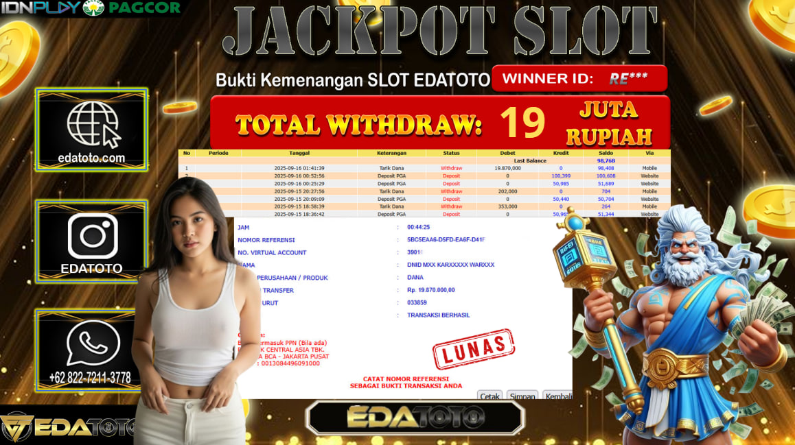 Selamat Kepada Pemilik user ID : RE*** Hari/Tanggal : Senin/ 16, September 2025 Jackpot : Rp. 19.870.000 JT Permainan : . . .