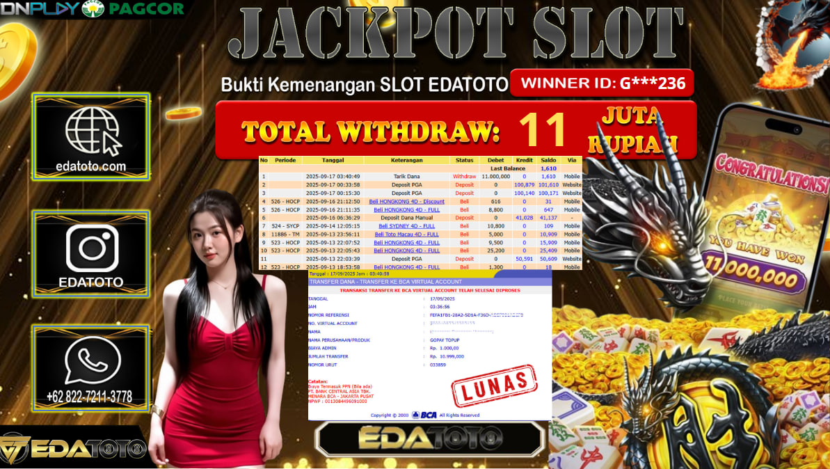 Selamat Kepada Pemilik user ID : G***236 Hari/Tanggal : Senin/ 17, September 2025 Jackpot : Rp. 11.000.000 JT Permainan : . . .