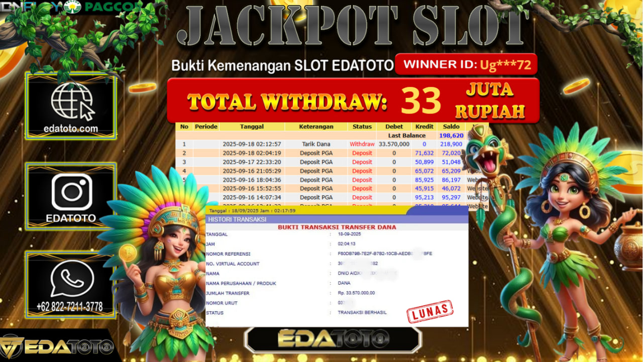 Selamat Kepada Pemilik user ID : Ug***72 Hari/Tanggal : Senin/ 18, September 2025 Jackpot : Rp. 33.570.000 JT Permainan : . . .
