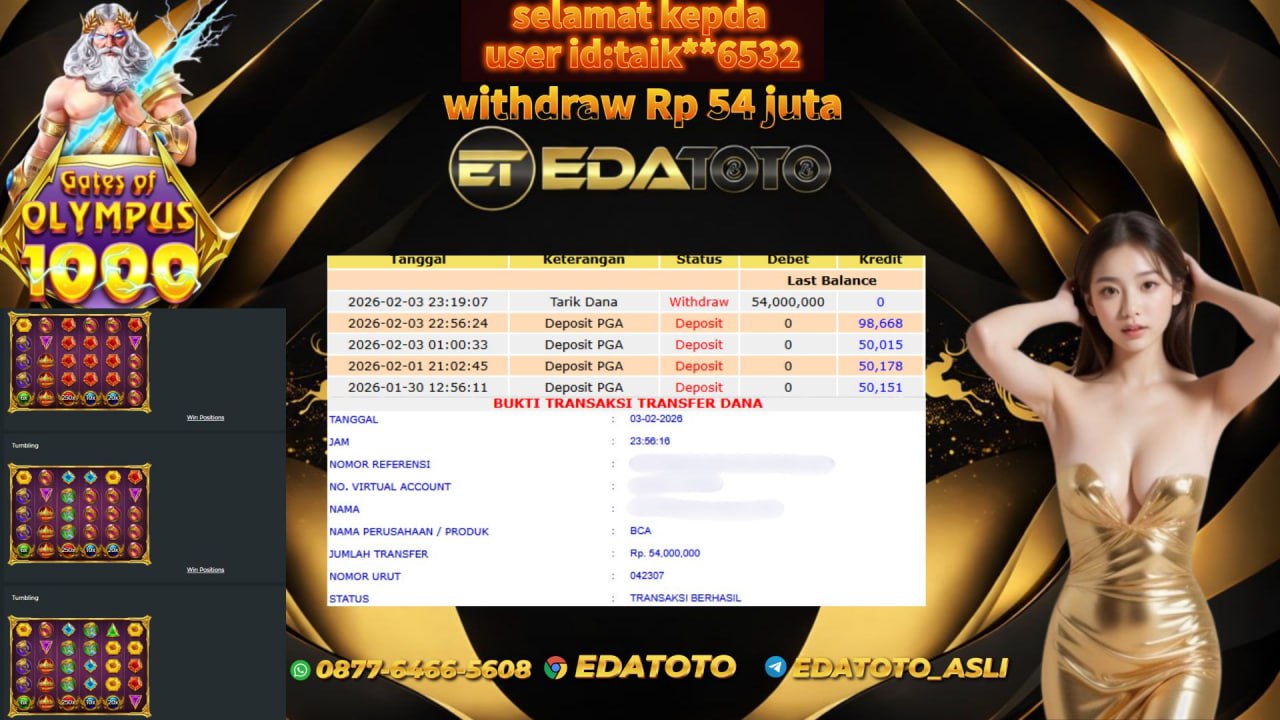 Selamat Kepada Pemilik user ID : TAIK**6532 Hari/Tanggal :selasa/ 03 februari 2026 Jackpot : Rp. 54,000,000 JT Withdraw : 54,000,000 . . .
