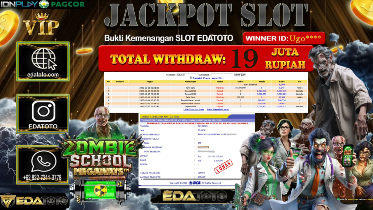 Selamat Kepada Pemilik user ID : Ugo**** Hari/Tanggal : Kamis / 16, Oktober 2025 Jackpot : Rp. 19.700.000 JT Permainan . . .